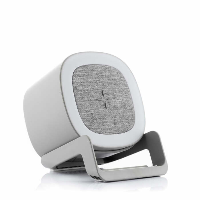 Un originale caricabatterie wireless con luce LED e altoparlante che ha un pulsante touch per attivare la luce LED e 2 zone di supporto per posizionare il cellulare in posizione orizzontale o verticale.