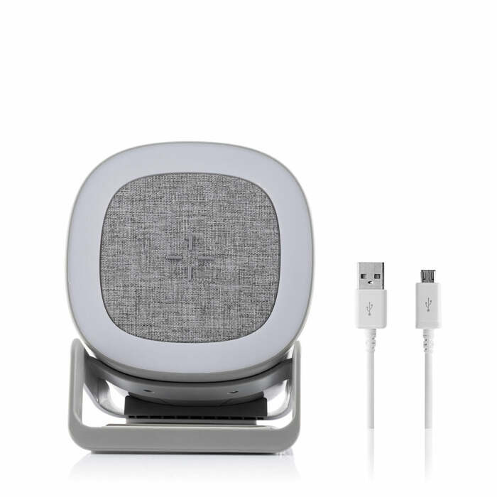 - Ricarica a induzione (10 W max): questo caricabatterie wireless con altoparlante Bluetooth e luce LED è ideale per ricaricare i cellulari in tutta comodità. La base di ricarica wireless dispone di 2 zone di supporto per posizionare il cellulare orizzontalmente o verticalmente durante la ricarica. La zona per la ricarica frontale è in tessuto di poliestere. Include cavo USB-C.