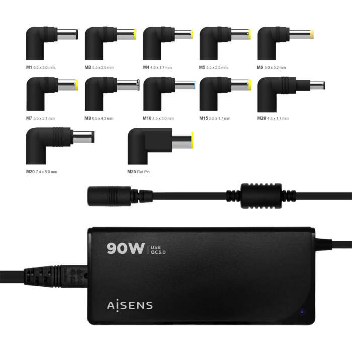 Il caricatore per portatile ASLC-90WAUTO-BK del marchio Aisens è un dispositivo di alimentazione universale progettato per offrire una soluzione versatile e sicura per la ricarica di un’ampia gamma di dispositivi elettronici, inclusi portatili, cellulari, fotocamere e tablet. Con una potenza di 90W e una tecnologia di ricarica rapida QC3.0 (Quick Charge 3.0) che massimizza velocità e compatibilità tramite la porta USB-A, questo caricatore è ideale per utenti che richiedono efficienza e flessibilità. Il design include 12 connettori DC intercambiabili che garantiscono adattabilità con diversi marchi e modelli di portatili grazie alle varie specifiche di tensione e diametro, come 15V, 16V, 18,5V, 19V e 19,5V, compatibili con produttori come Toshiba, Lenovo, HP, Acer, Asus, Dell, Sony e altri. Il caricatore supporta un ingresso di tensione ampio di 100-240V, rendendolo adatto all’uso internazionale. Presenta inoltre un design compatto ed elegante di colore nero, con un cavo lungo 1,2 metri per comodità d’uso. È dotato di sistemi di protezione multipli che garantiscono la sicurezza del dispositivo e dell’attrezzatura collegata, prevenendo sovraccarichi e altri danni elettrici. Le dimensioni del caricatore sono 135 mm di profondità e 57 mm di larghezza, mentre l’imballaggio misura 225 mm di altezza, 138 mm di larghezza e 55 mm di profondità. Certificato secondo le normative CE e RoHS, assicura qualità e conformità ambientale. Complessivamente, il caricatore Aisens ASLC-90WAUTO-BK rappresenta una soluzione pratica e universale per utenti che cercano un caricatore affidabile, adattabile ed efficiente per dispositivi elettronici con diverse esigenze di potenza e connettività.