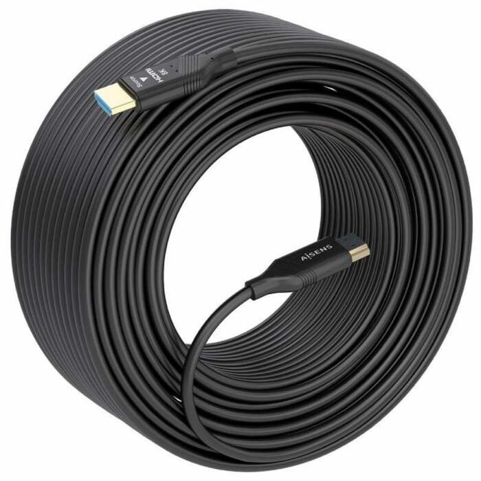 Il cavo HDMI del marchio Aisens è una soluzione avanzata progettata per la trasmissione di video e audio con la massima qualità e stabilità, ideale per installazioni professionali o ambienti domestici che richiedono lunghe distanze senza perdita di segnale. Questo cavo dispone di connettori HDMI maschio tipo A ad alta compatibilità su entrambe le estremità, di colore nero, garantendo una connessione sicura e universale con dispositivi compatibili. La sua lunghezza di 30 metri lo rende un’ottima scelta per collegare apparecchi distanti, come lettori multimediali, console, TV, monitor o proiettori senza necessità di amplificatori aggiuntivi. Si distingue per essere un cavo HDMI 2.1 ad altissima velocità che supporta risoluzioni fino a 8K@60Hz e 4K@120Hz con profondità colore completa 4:4:4, ideale per utenti che richiedono la migliore esperienza audiovisiva con formati di ultima generazione. La velocità di trasferimento raggiunge i 48 Gbps, permettendo una riproduzione fluida di contenuti in alta definizione e supportando tecnologie HDMI avanzate come HEC (HDMI Ethernet Channel) per la trasmissione dati e funzionalità extra. Inoltre, include supporto per HDCP, garantendo protezione e compatibilità con contenuti protetti da copyright, fondamentale per l’uso con piattaforme di streaming e dispositivi commerciali. Essendo un cavo AOC (Active Optical Cable), utilizza tecnologia in fibra ottica al suo interno per mantenere una trasmissione stabile e priva di interferenze elettromagnetiche su lunghe distanze, superando i limiti dei cavi in rame tradizionali. La costruzione robusta e il design moderno consentono un’installazione duratura e affidabile, adattandosi a diversi scenari che richiedono alte prestazioni tecniche. In sintesi, questo cavo HDMI di Aisens rappresenta uno strumento di connettività avanzata che offre prestazioni ottimali, copertura estesa e pieno supporto alle ultime specifiche dello standard HDMI 2.1.