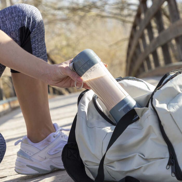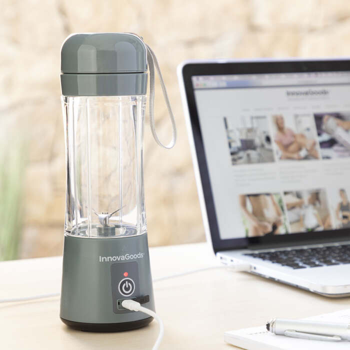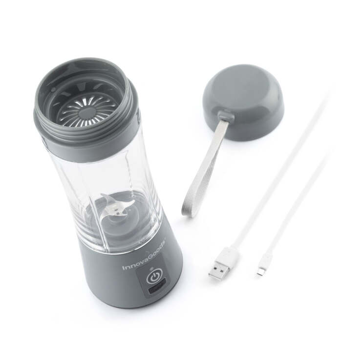 Il frullatore portatile ricaricabile Shakuit InnovaGoods è ideale per preparare frullati, succhi e smoothie in modo comodo a casa, in ufficio, in palestra, ecc. Questo frullatore ricaricabile è dotato di 4 lame e di un filtro di uscita interno per versare il contenuto pronto da bere, senza grumi o polpa. Grazie al suo design compatto e portatile, può essere facilmente trasportato ovunque in borsa, nello zaino, ecc. È inoltre dotato di un laccio per il trasporto appeso al coperchio e si smonta facilmente per la pulizia.