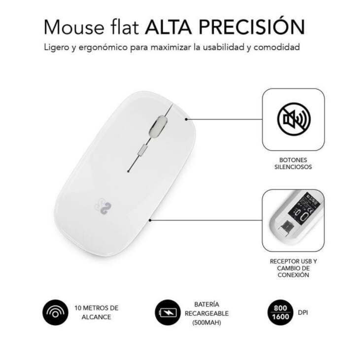 Il mouse Bluetooth wireless Subblim SUBMO-DFLAT21 è un dispositivo versatile ed ergonomico progettato per offrire un’esperienza d’uso comoda e precisa in ambienti d’ufficio o studio. Questo mouse si distingue per la doppia connessione, che consente l’abbinamento simultaneo a due dispositivi tramite Bluetooth 5.1 a basso consumo (BLE) e un ricevitore mini USB tipo A a radiofrequenza, facilitando il passaggio immediato tra dispositivi senza dover riconfigurare le connessioni. Il suo design ambidestro include impugnature in gomma che migliorano la presa, realizzato in ABS sintetico resistente con una superficie monocromatica bianca che dona un aspetto pulito e professionale. Offre alta precisione grazie al sensore ottico con risoluzione configurabile fino a 1600 dpi distribuita in tre modalità regolabili, ideale per diversi usi e superfici, con movimento fluido e senza salti grazie alla tecnologia di rilevamento ottico laser. Integra quattro pulsanti a pressione, incluso un interruttore DPI per personalizzare la sensibilità, e una rotella di scorrimento con rivestimento in silicone antiscivolo e tatto piacevole, che consente uno scorrimento verticale comodo e silenzioso. Questo modello incorpora la tecnologia Silent Click, che riduce il rumore dei clic per ambienti silenziosi o condivisi. In termini di autonomia, dispone di una batteria integrata al litio ricaricabile da 500 mAh con ricarica tramite cavo Micro USB tipo B, eliminando la necessità di batterie usa e getta e facilitando l’uso continuo anche durante la ricarica. Inoltre, ha la funzione di spegnimento automatico per risparmiare energia quando non è in uso, attivabile premendo un qualsiasi pulsante. È compatibile con i sistemi operativi Windows (da Vista a Windows 11), macOS, ChromeOS e piattaforme mobili come Android, iOS e iPadOS, garantendo ampia connettività. Il mouse pesa solo 64 grammi, misura 112 mm di altezza, 58 mm di larghezza e 20 mm di profondità, risultando compatto e leggero da trasportare. La sua interfaccia combina tecnologie wireless RF Wireless, Bluetooth e USB Tipo A, con un ricevitore mini molto piccolo e leggero per minimizzare lo spazio occupato nel computer. Dispone inoltre di certificazioni di sostenibilità CE e ROHS, conformi alle normative ambientali e di sicurezza. In sintesi, il Subblim SUBMO-DFLAT21 è un mouse multifunzione, efficiente e confortevole che integra tecnologia avanzata e design ergonomico per un uso prolungato e produttivo in ambito lavorativo e scolastico.