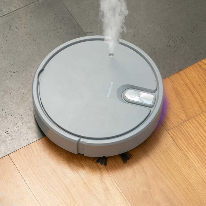 Un robot aspirapolvere intelligente dotato di luce UV per disinfettare, un umidificatore-diffusore di aromi e 2 spazzole rotanti per pavimenti. Serbatoio raccogli polvere estraibile. Serbatoio dell’acqua: 220 ml.